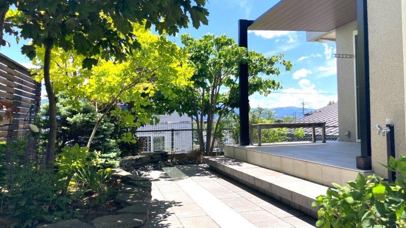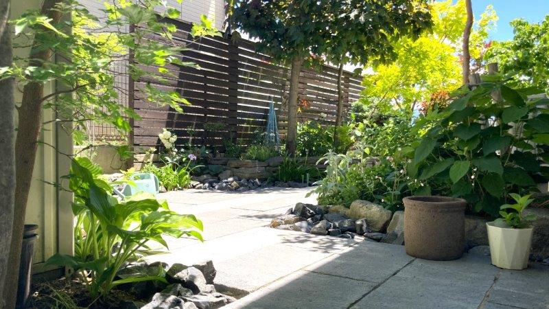 植物が多いお庭で、尚且つローメンテナンスもご希望されていたため、床面はなるべく土を見せずに、植栽スペースを花壇で囲って集約させました。