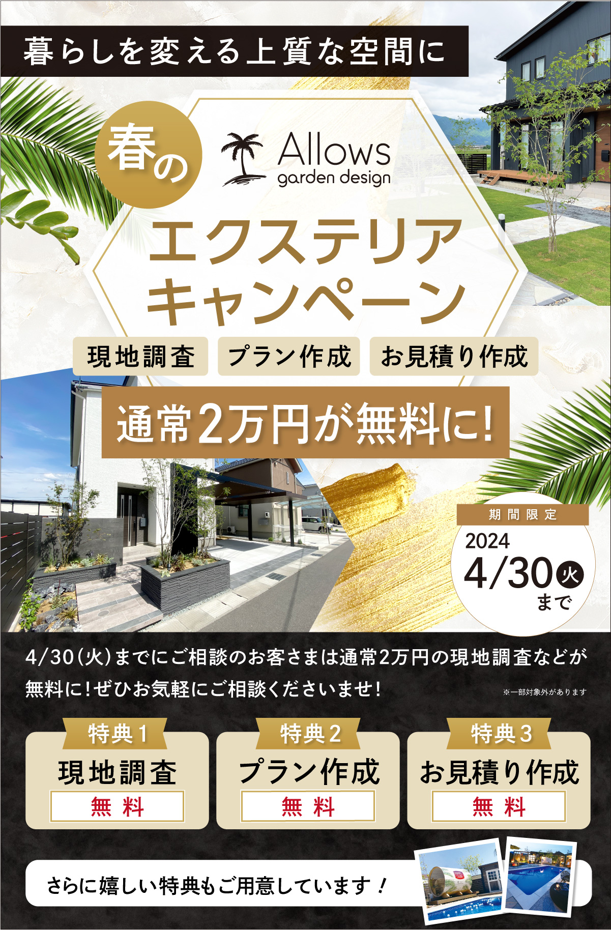 この期間にご相談をいただいたお客様は、通常2万円の現地調査・プラン作成・見積作成を無料でご案内させていただきます!