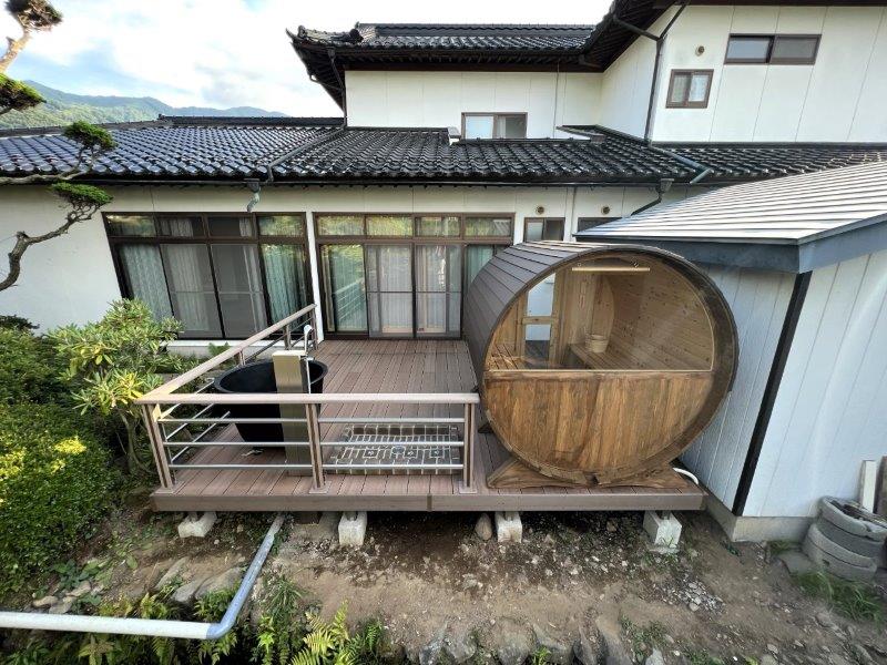 ①バレルサウナ本体は国産ヒノキ ②気密性を高め、雨漏れなし ③ハイグレードのサウナストーブ ④当社職人による責任施工