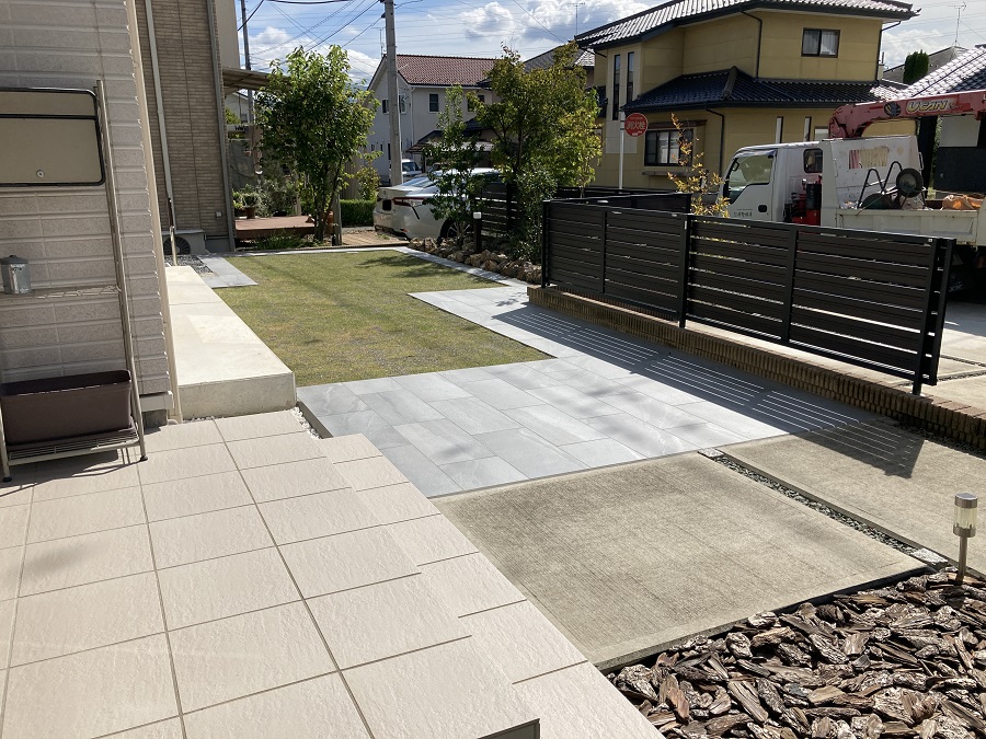 玄関側はタイルの園路と繋がりのあるテラスをつくりました!
