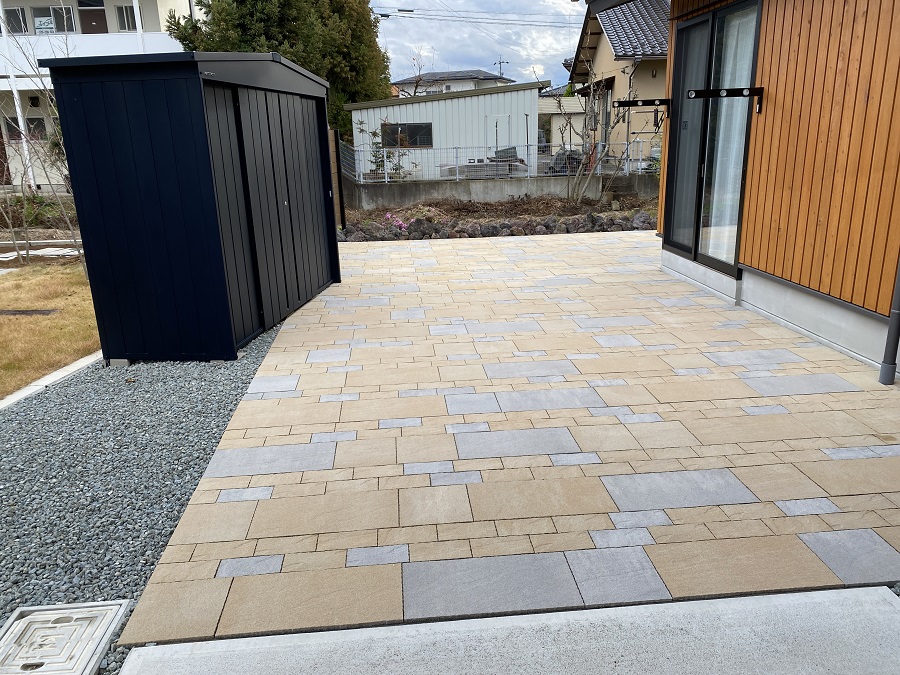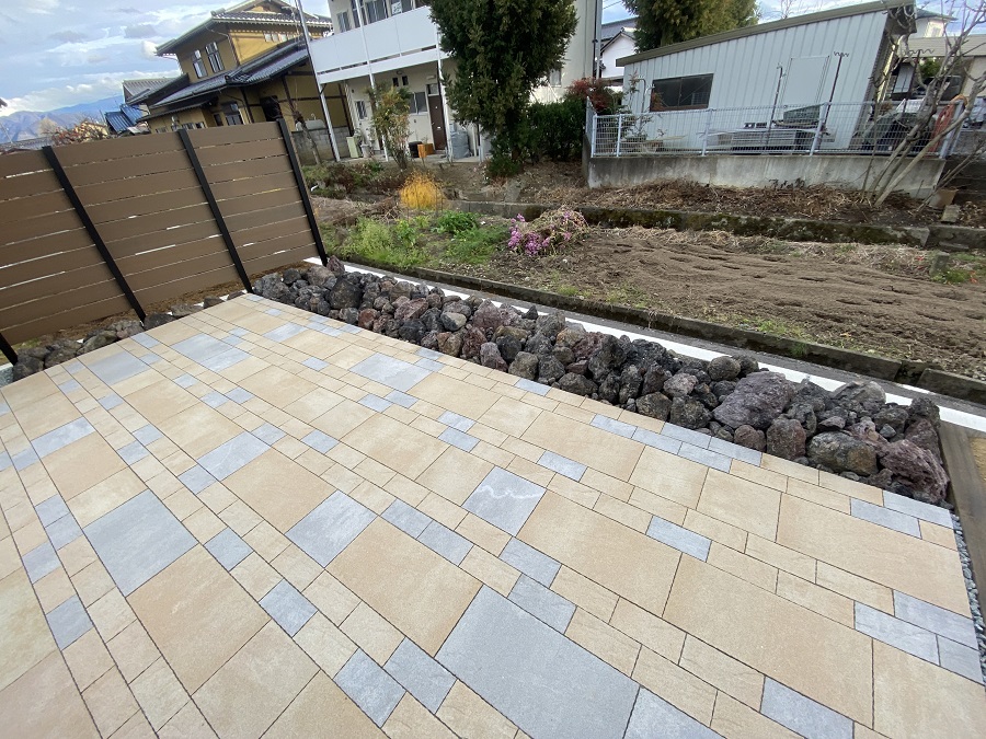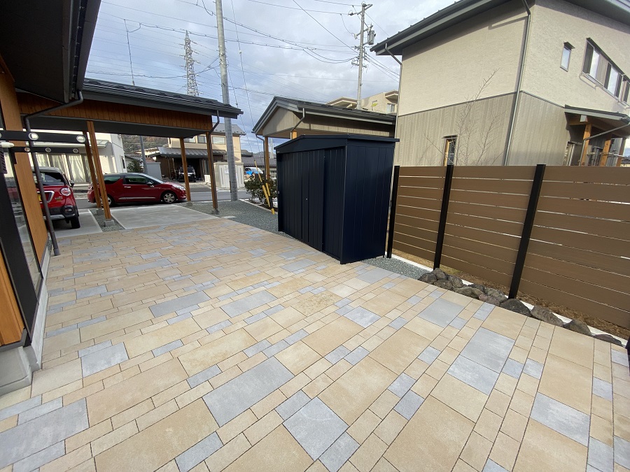 駐車場の奥は東洋工業のプラーガペイブとプラーガブリックをリズミカルに敷き詰めました。