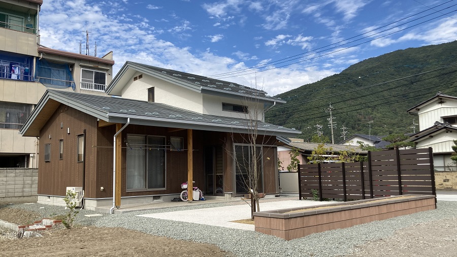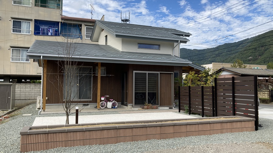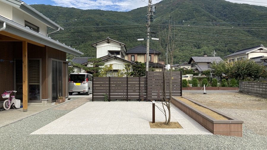 道路からの目隠しフェンスとテラス、花壇が完成致しました。