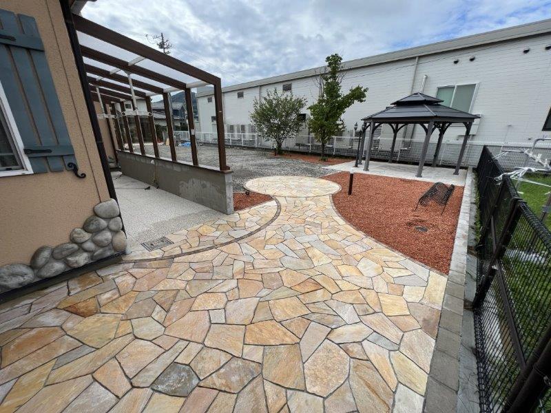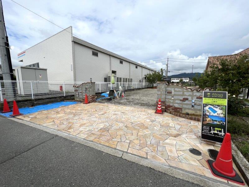 石張りの目地とウォールの塗り仕上げ、駐車スペースの舗装が未工事です。