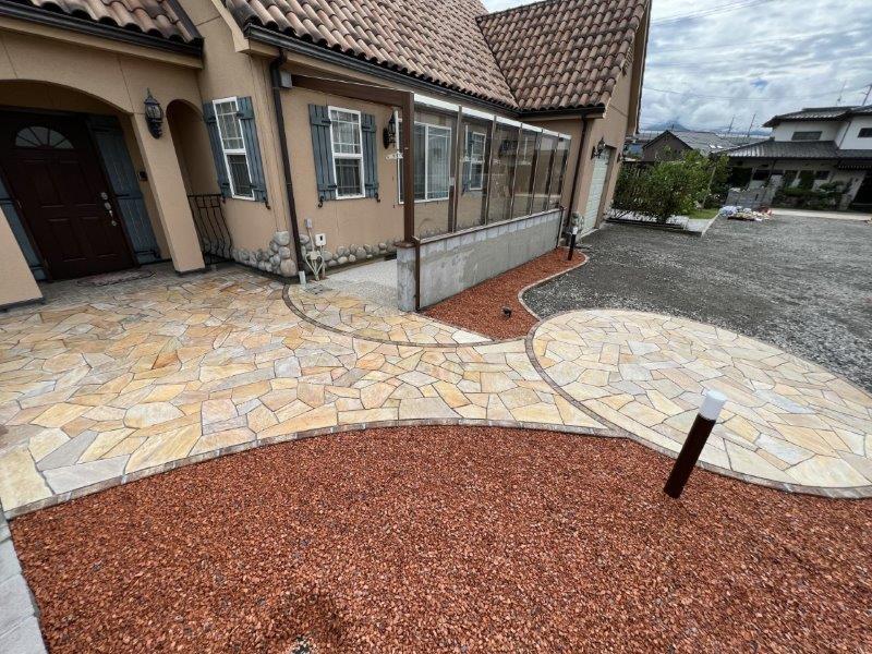 アプローチやウォールには曲線形状を取り入れ、素材は乱形の天然石・塗り壁・ヨーロッパ瓦を使用しました。