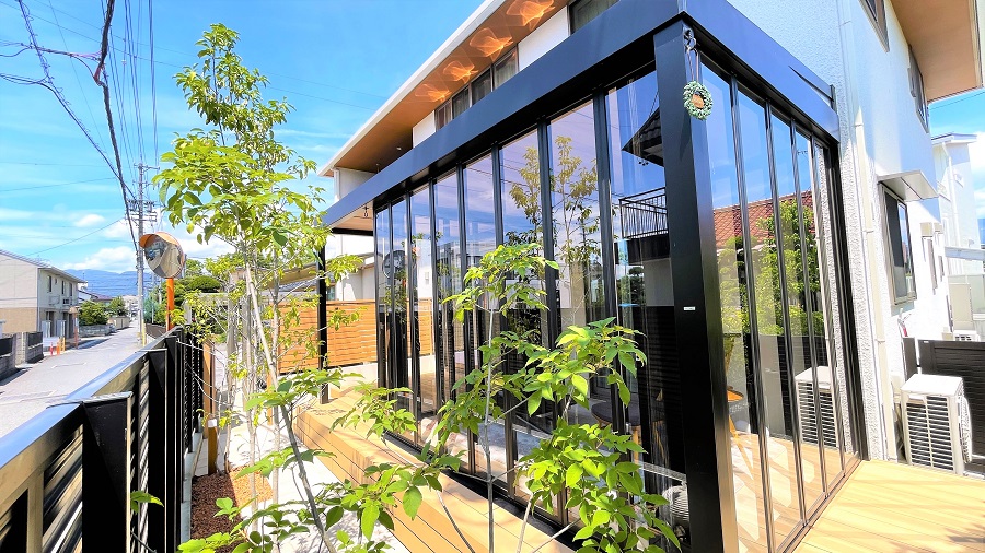 ブラックのフレームに内天井と軒は木調を取り入れ、モダンでシックな印象のガーデンルームに。