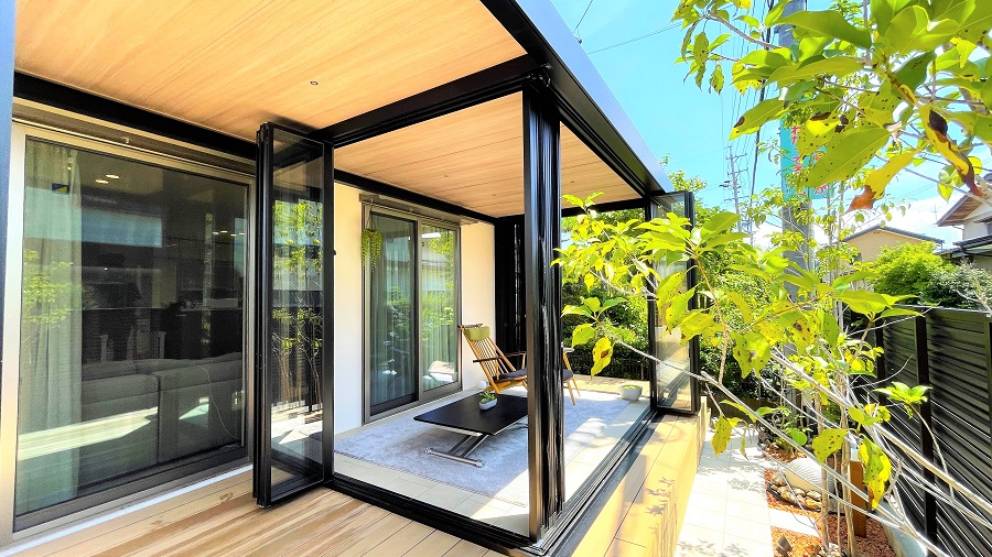 広々としたウッドデッキと、ガーデンルーム『ジーマ』の軒プラスタイプを設置。