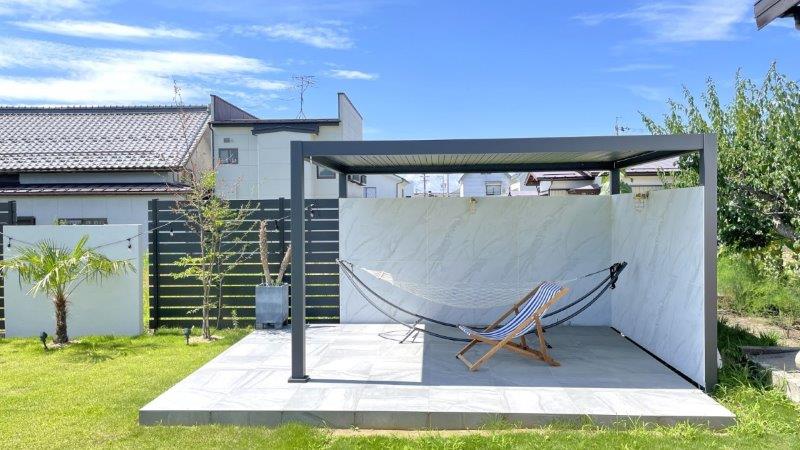 また南西のコーナーにアネックス空間としてルーフを設置し、西日も遮りながら過ごせる空間が出来上がりました。