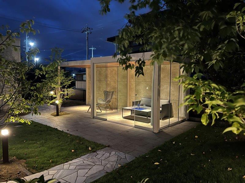 ガーデン空間は、アネックススペースとしてタカショーのオールグラスポーチを設置。