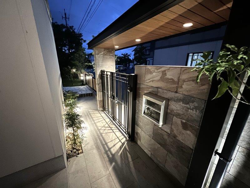 アプローチには屋根を配置し、ダウンライトを埋め込んであります。