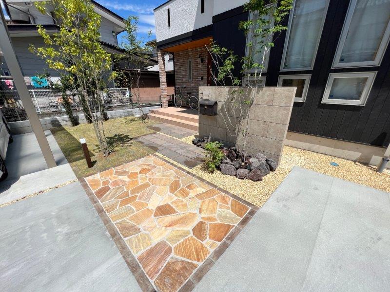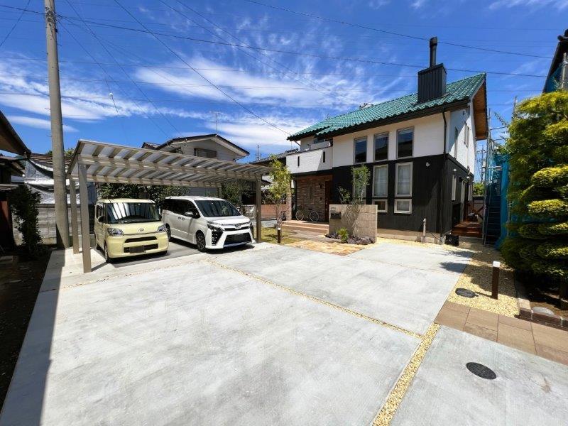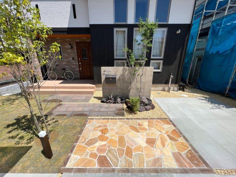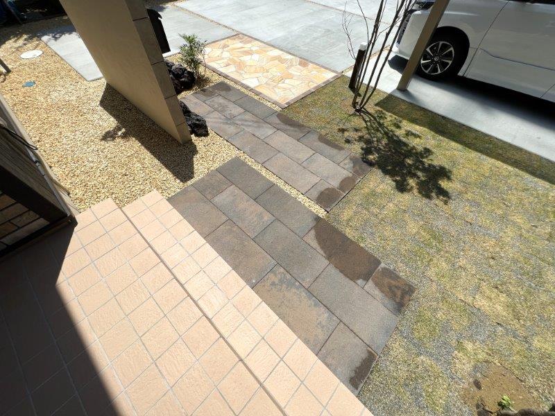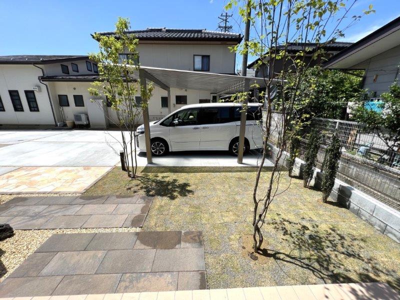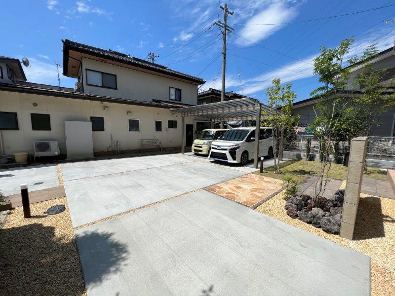 宅地延長道路から駐車スペースはコンクリート舗装で、アプローチなどのファサードには高品質の素材を使用し、エントランスを際立たせました。