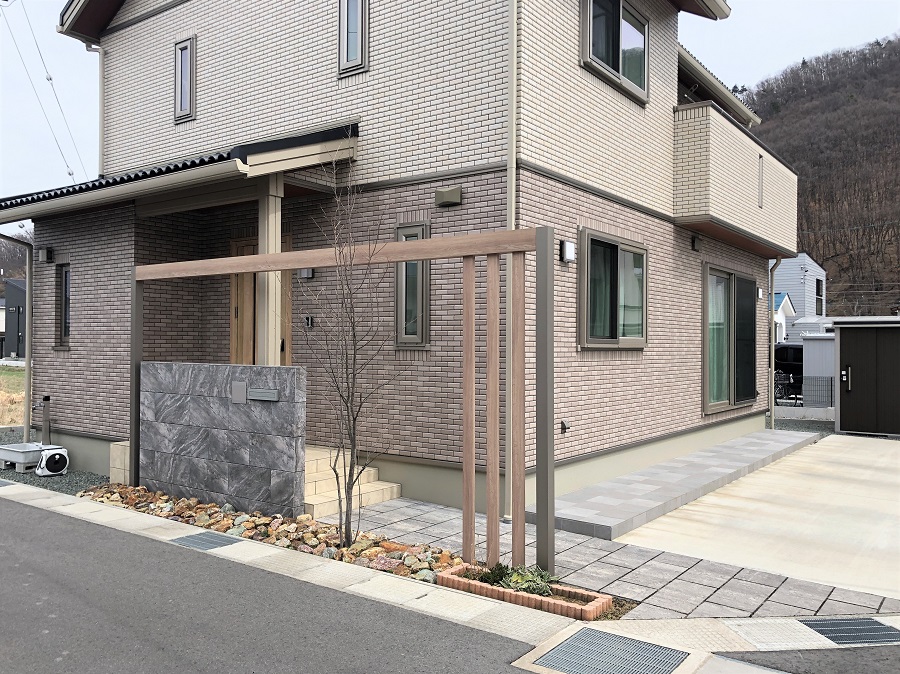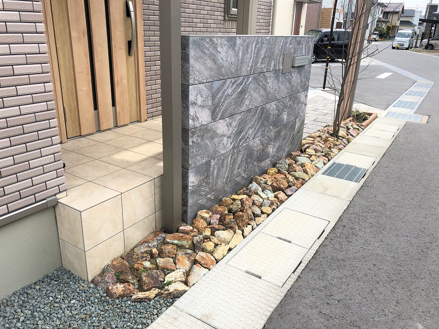 冷たい印象になりがちな色使いですが、植木と天然のゴロタ石であたたかみを演出。