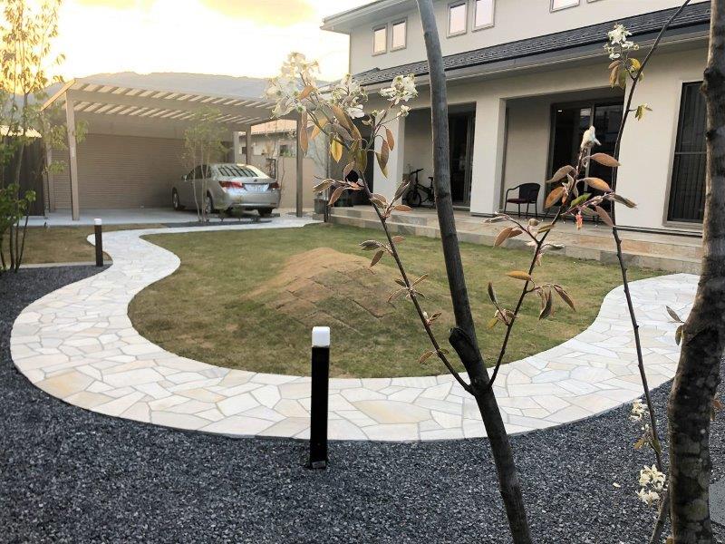 ホワイト系の石張りと芝生のグリーンのコントラスト・・・。
