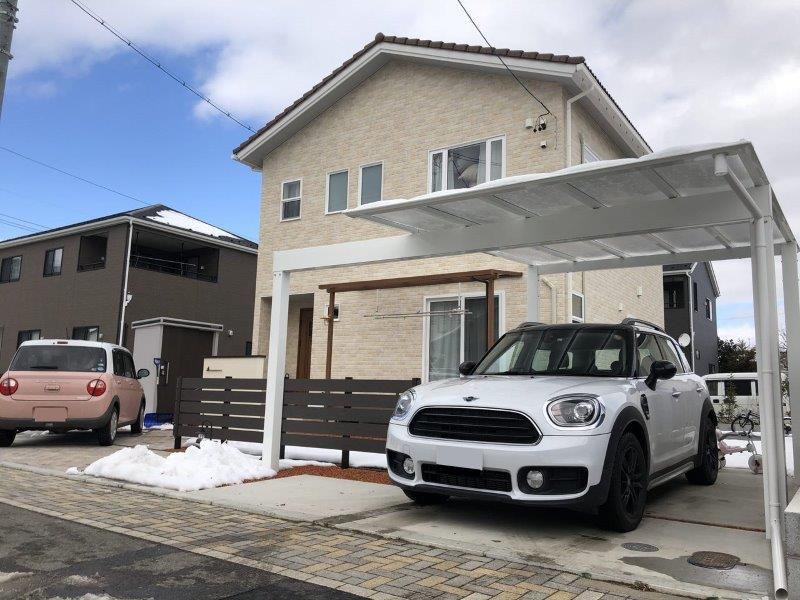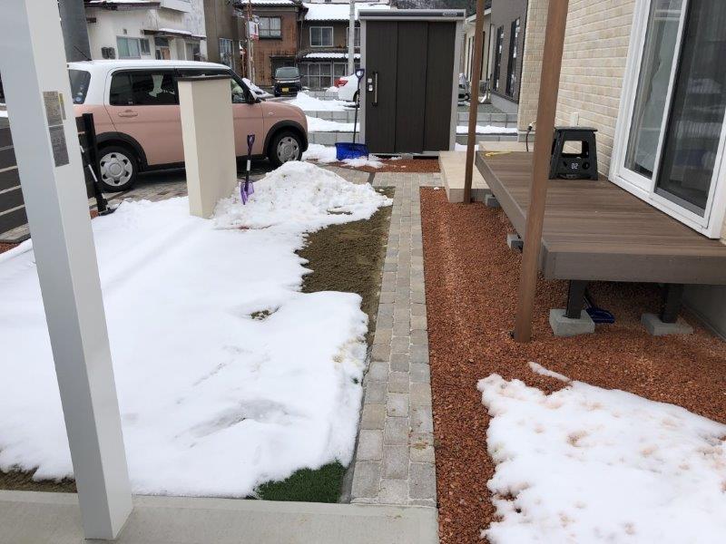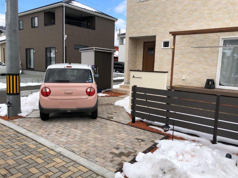 駐車場やアプローチ、門袖、デッキ空間まで出来上がって、あとは春の植栽工事を残すだけです。