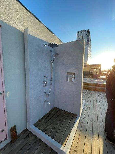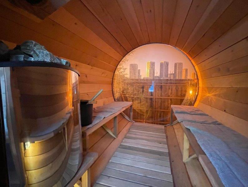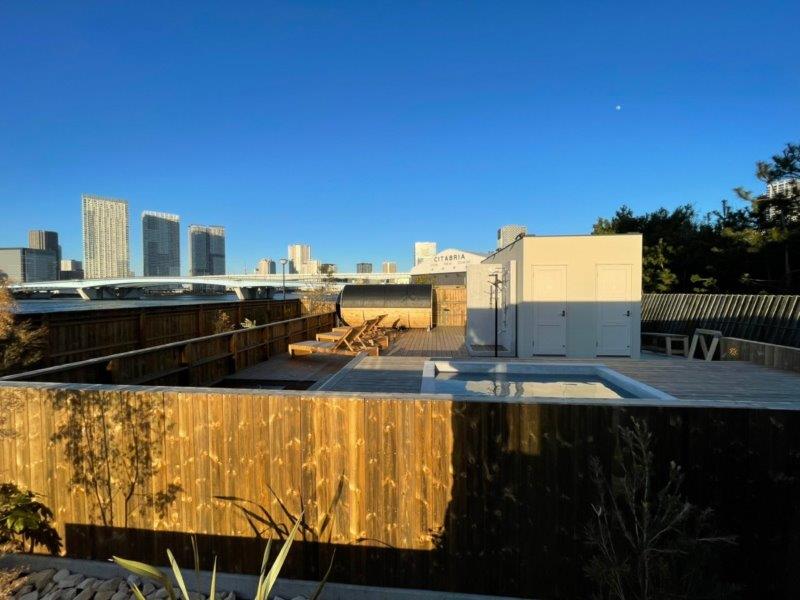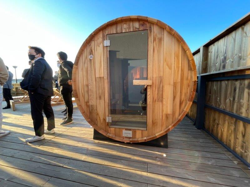 弊社でも近日導入される、バレル(樽)型サウナがここにも設置されていました!
