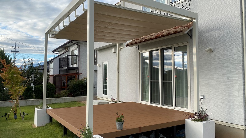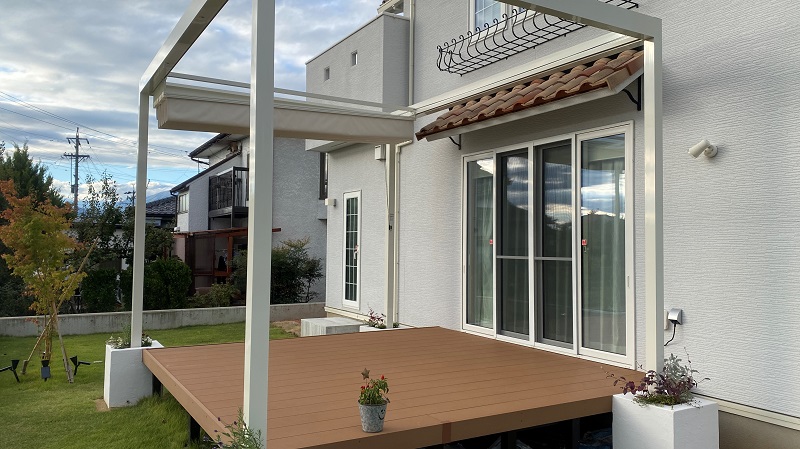 テラス屋根にはLIXILの独立オーニングを使用。