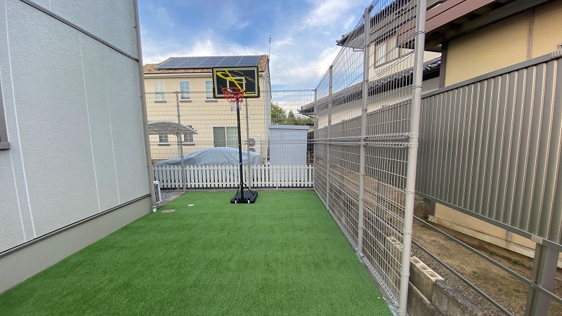 お子さんがバスケットボールを練習するスペースとして、床面は人工芝に。