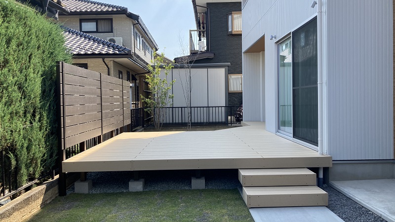 目線を気にせずにウッドデッキの上で過ごしていただく為に、しっかりと目隠しフェンスも設けています。