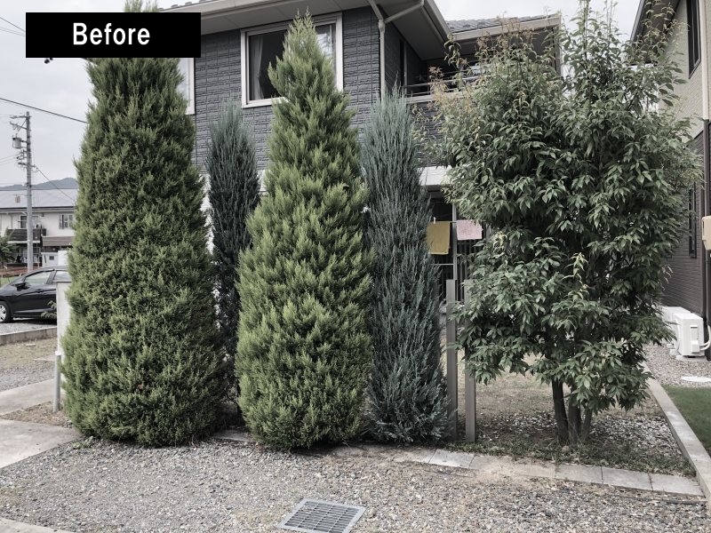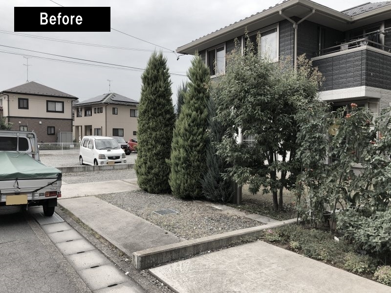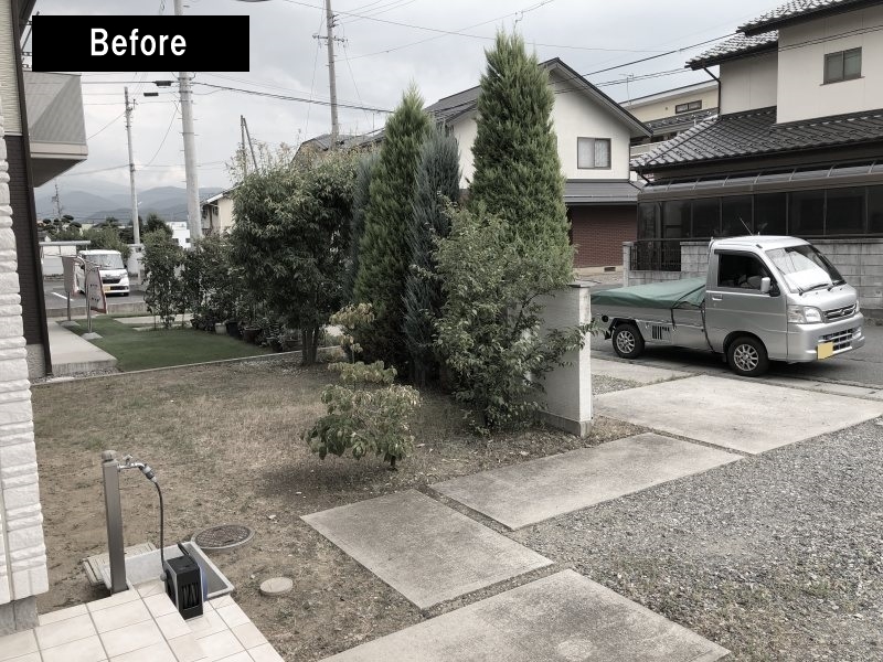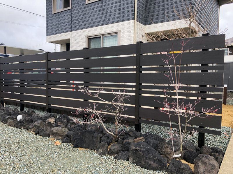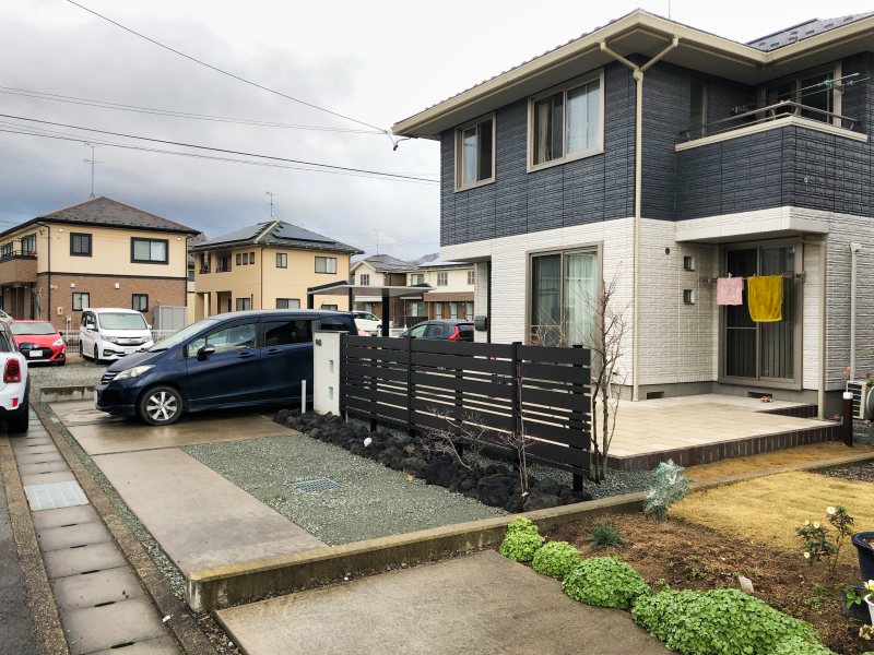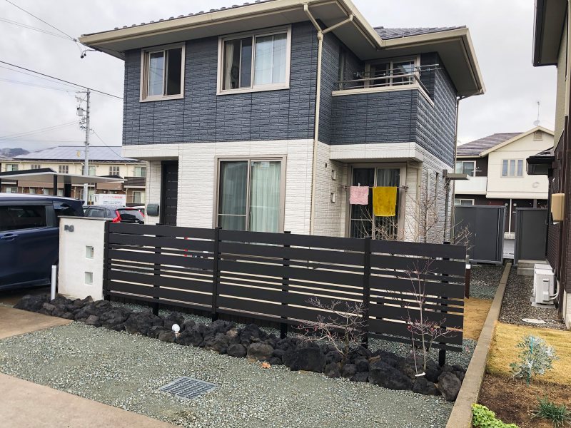 手に負えなくなったコニファー等は抜根し、新たに樹脂フェンスと浅間石で道路側をデザインしました。