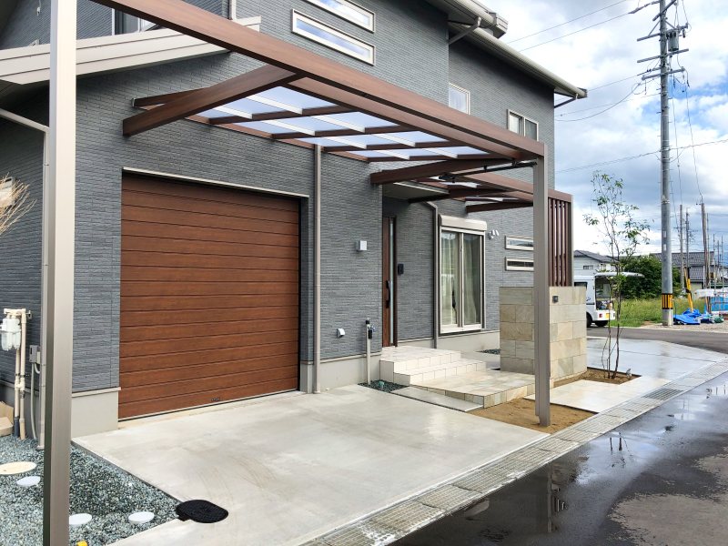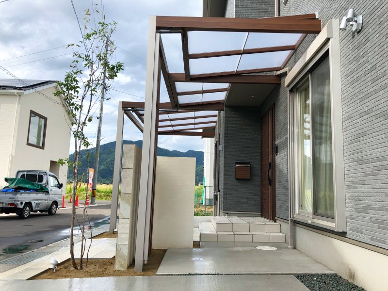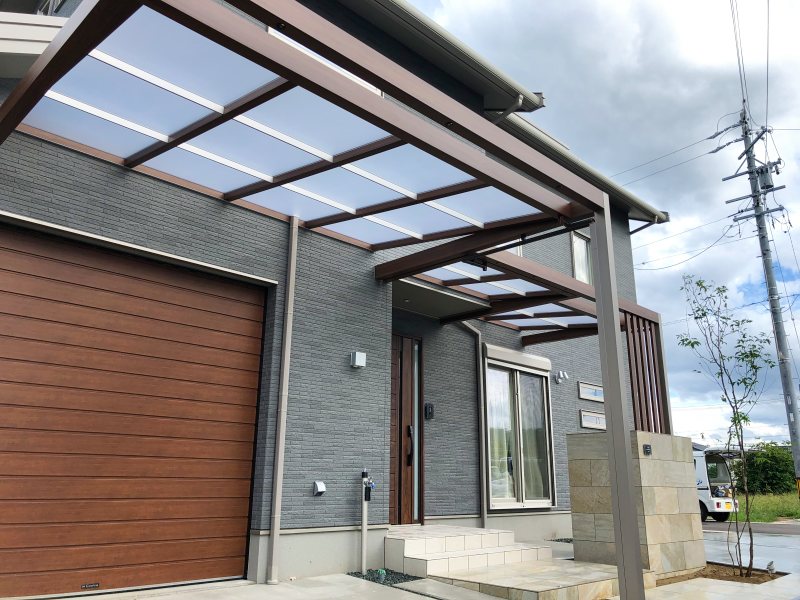 今回はガレージ前のルーフと組み合わせ、玄関屋根を拡張しています。