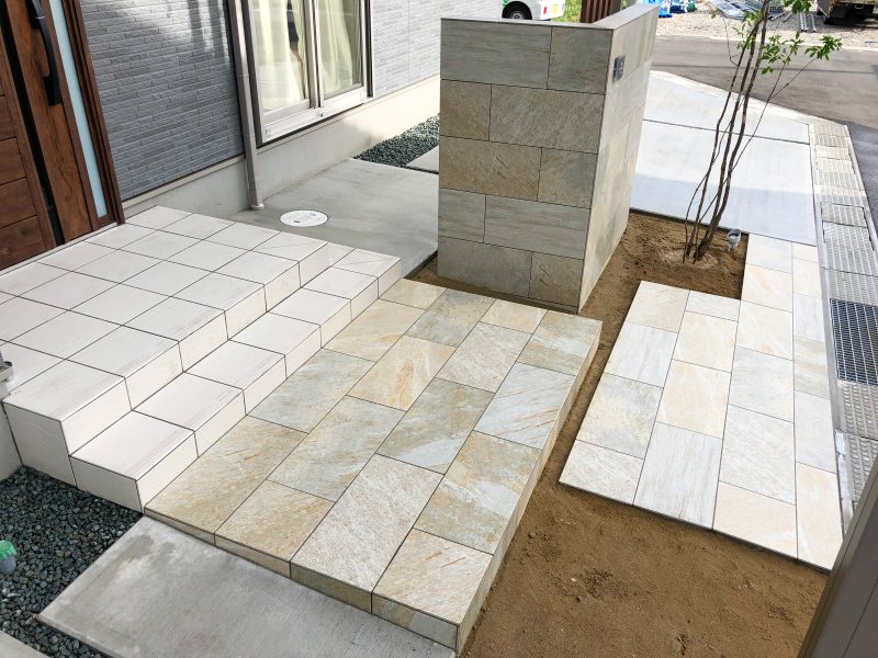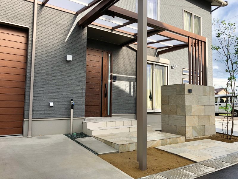 門袖とアプローチは石調の高級感のあるタイルを使用しています。