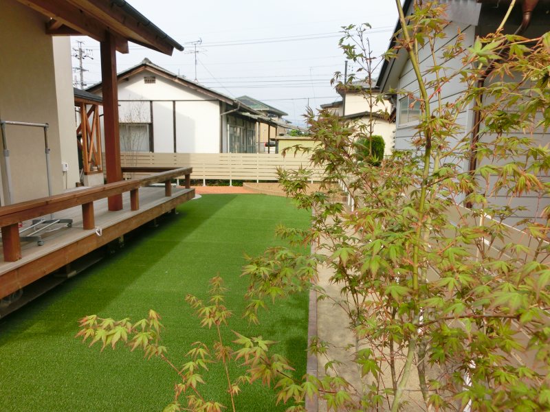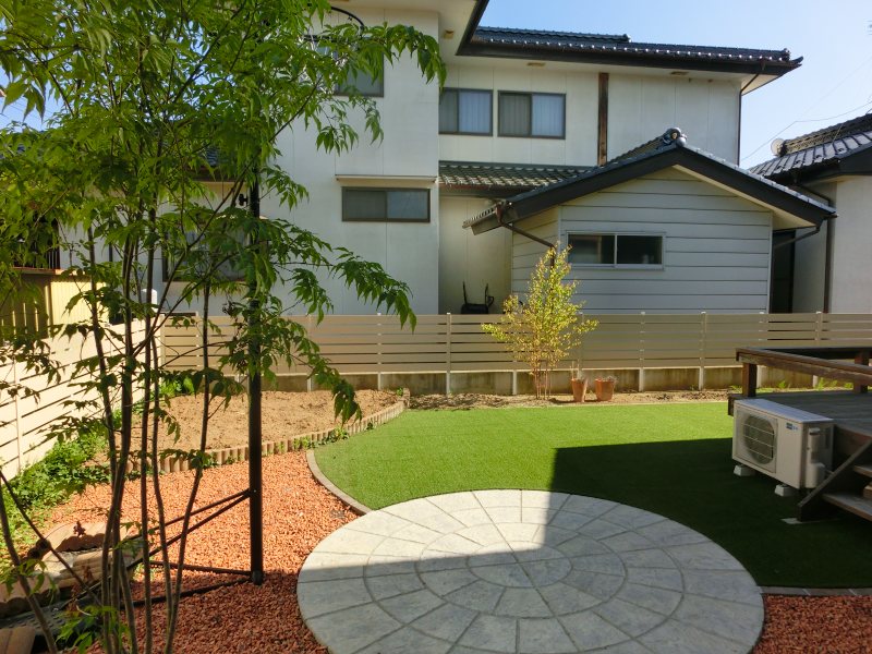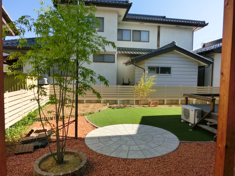 人工芝をメインに、サークル・瓦チップにてこちらもナチュラルな雰囲気に。