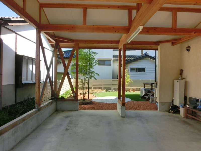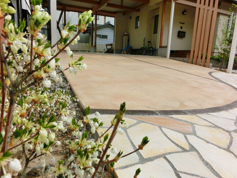 乱張りからガレージに続くスペースは、コンクリートに色付けをしナチュラルな仕上げにしています。