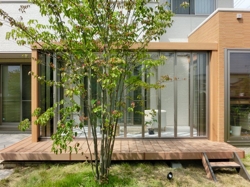 ガーデンルーム内のタイルテラスと外のウッドデッキで変化を持たせ、メリハリのある空間に。