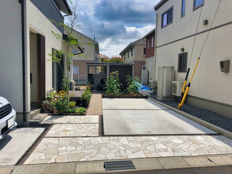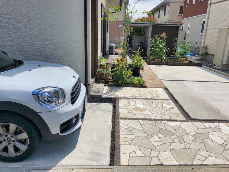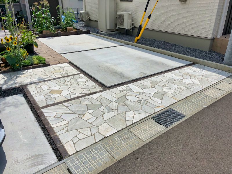 アプローチには、天然石の乱張りを使用。