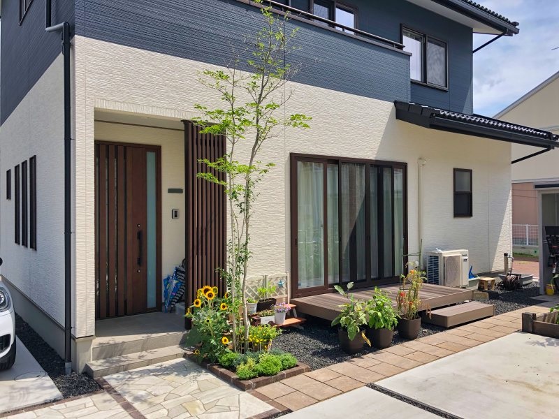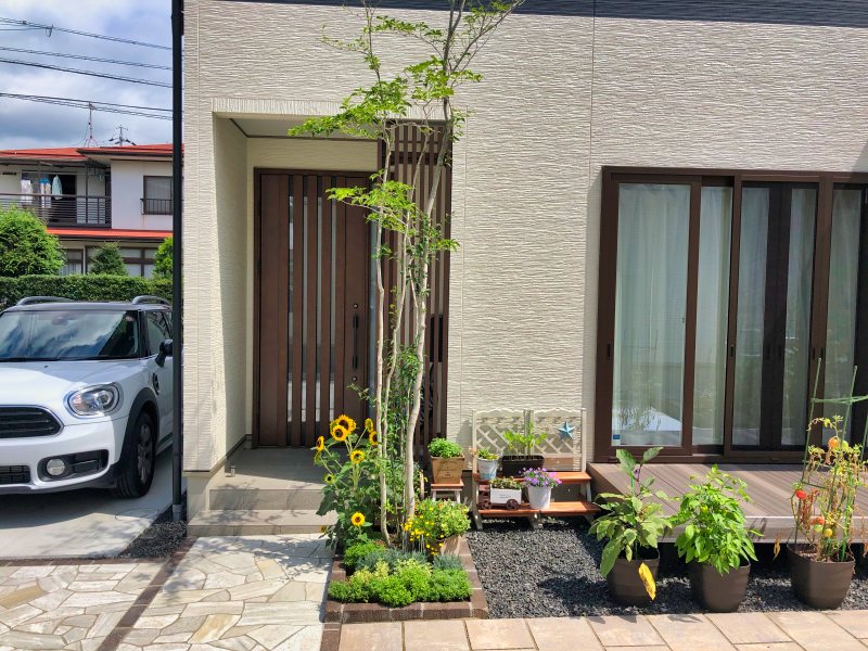 玄関前に植え付けたアオハダは、アプローチとガーデンの区切りに加え、ウッドデッキの西日除けも兼ねています。