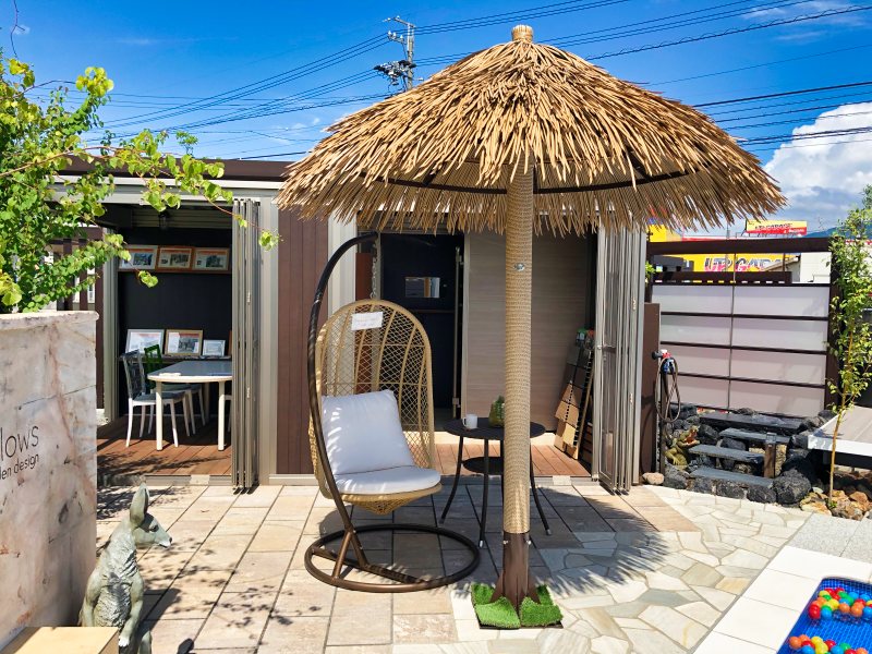 夏でも快適にお庭で過ごすためのパラソルを、展示場に設置しました。