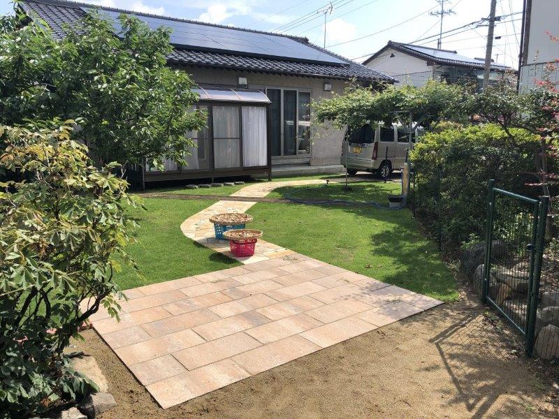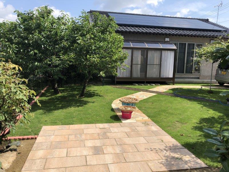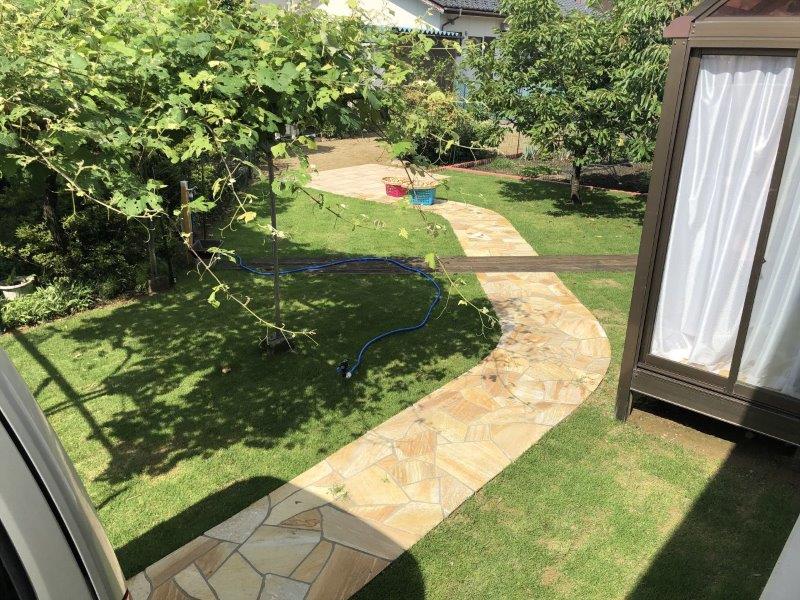 青々とした芝生と高級感のある石張りの園路で、すっきりとしたガーデンになりましたね!