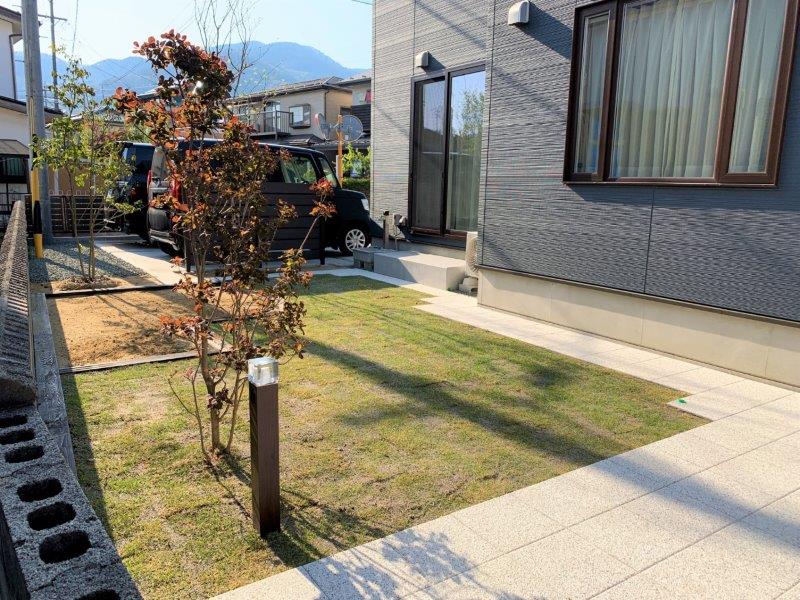 芝生のメンテナンスをしやすい様に見切りとして透水性インターロッキングで周りを囲んでいます。