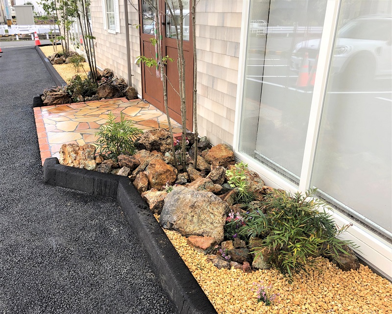店舗と駐車場の間のスペースを、雑草除去等のメンテナンスをしなくても済むように防草シートを敷き、表面に化粧砂利を敷きました。