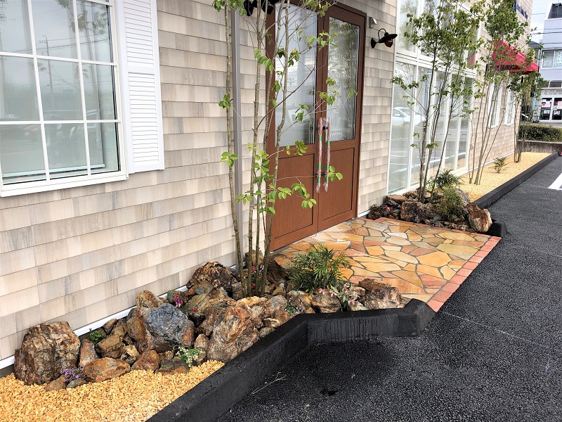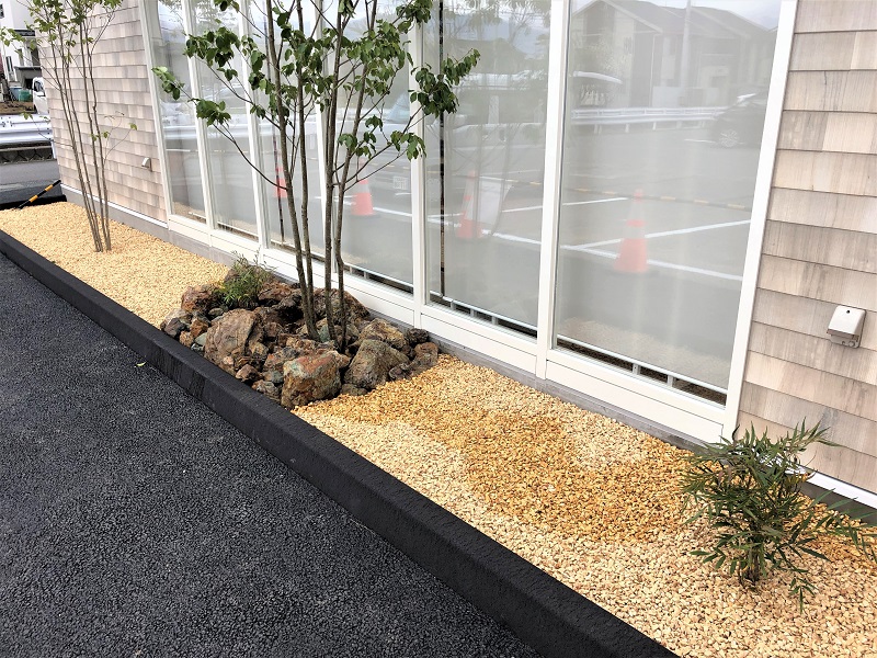 店舗と駐車場の間のスペースを、雑草除去等のメンテナンスをしなくても済むように防草シートを敷き、表面に化粧砂利を敷きました。