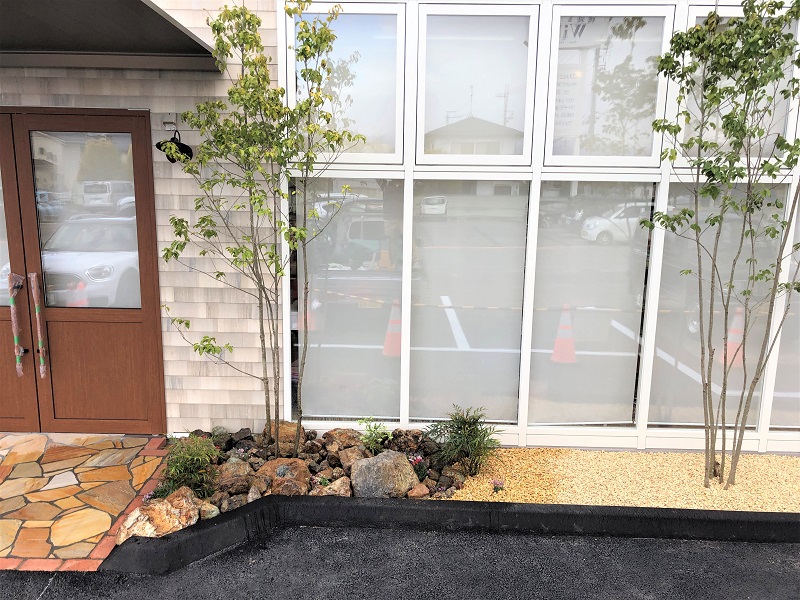 全てを化粧砂利にするのではなく所々にゴロタ石や植栽が入ることによって、変化が生まれ飽きの来ない印象になります。