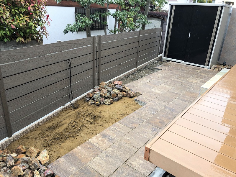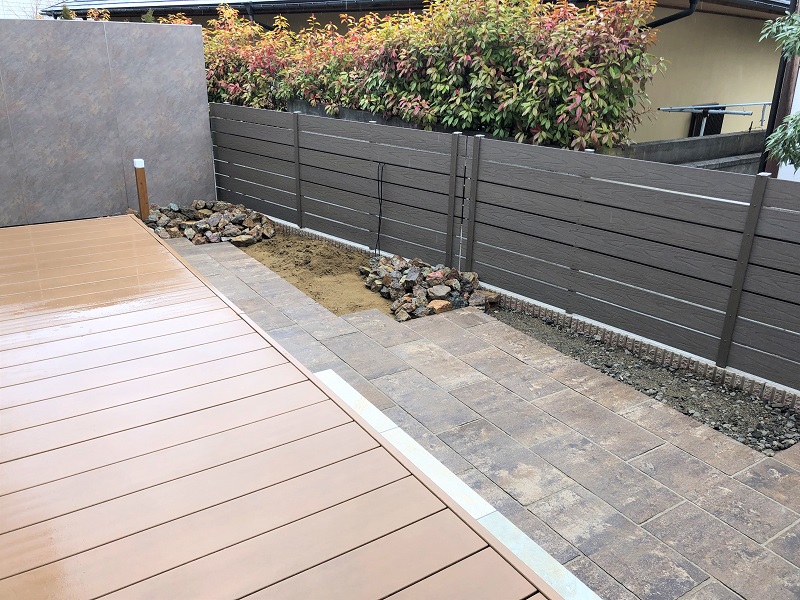 ウッドデッキを降りた空間には、インターロッキングのテラスが広がります。