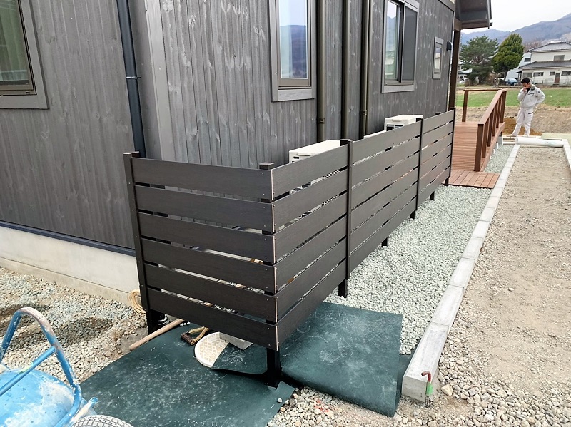 室外機の目隠しに、木目調で樹脂製のフェンスを設置。