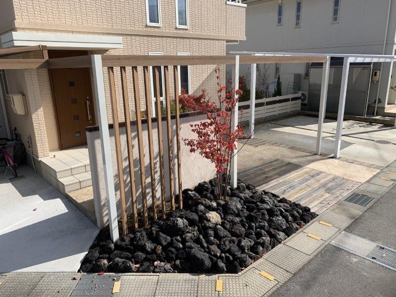 門袖前は、既存の樹木の周りに浅間石を敷き詰めています。