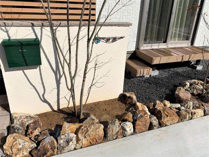 中央にはシンボルツリーとしてアオダモを植えました。ご家族と共に成長していく姿が楽しみです。