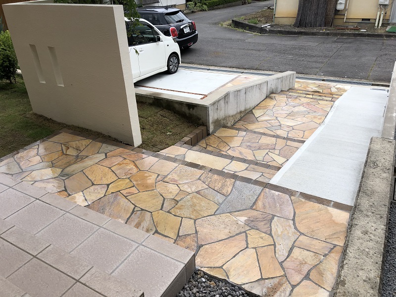 アプローチに黄色い天然石の乱張りをさせて頂きました。