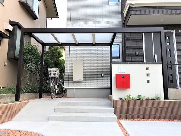 舗装面はコンクリートで統一し予算を抑え、その分をアプローチルーフや門袖に回していただきました。