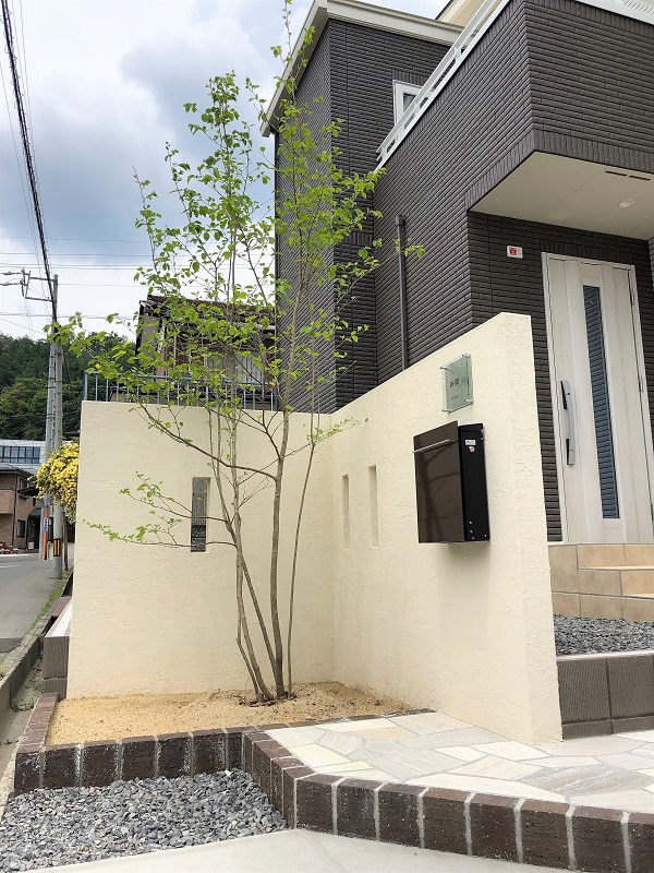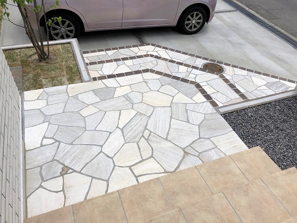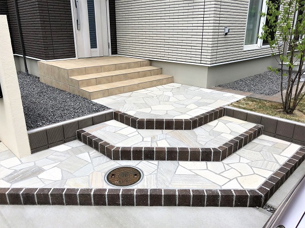 門袖、アプローチの石にはホワイト系を選択し、ダークブラウンのレンガで引き締めています。