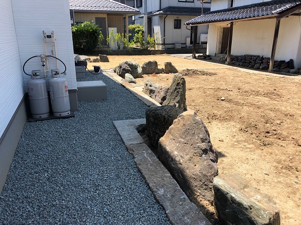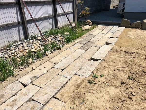芝生と砕石の見切りや菜園の縁石、園路には既存の柴石をすべて流用させていただきました。