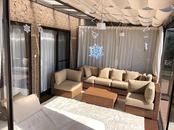 ちょっと寒い日には、ガーデンルームの中でラグジュアリーに・・・。