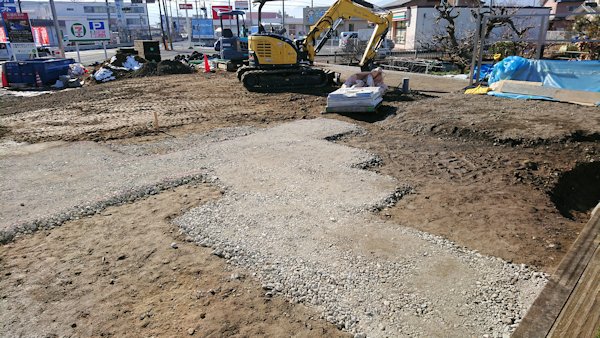 こんな感じの展示場を目指して、工事の方は重機三台を使用して全体的な路盤工事が進んでいます。