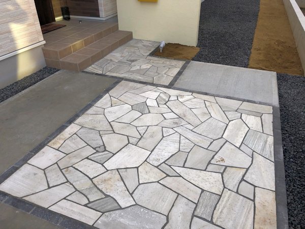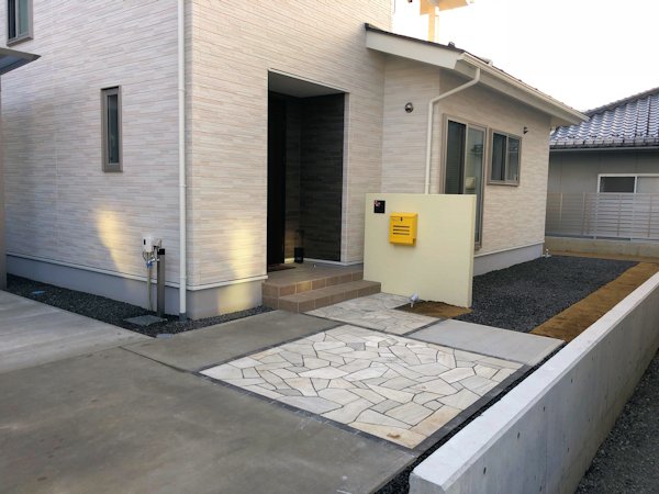 駐車場は土間コンクリート舗装ですが、エントランス部分とアプローチには高級感のある石張りを使用しました。