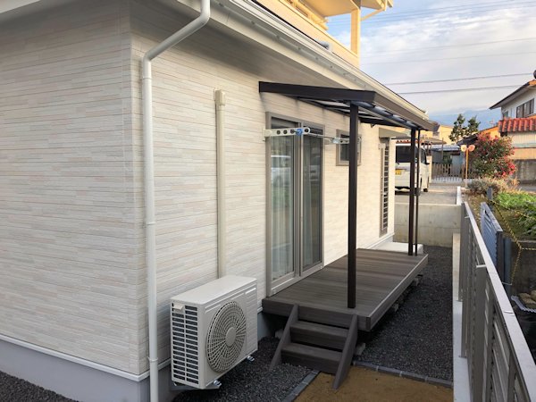 門袖を抜けると脇に菜園スペースがあり、さらに先に進むとテラスとウッドデッキがあります。