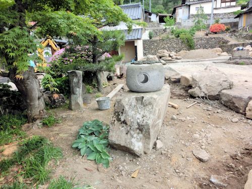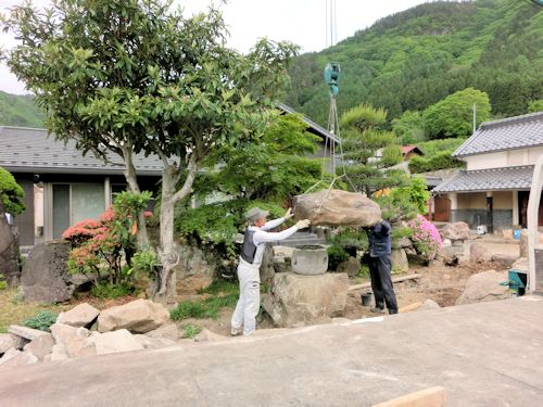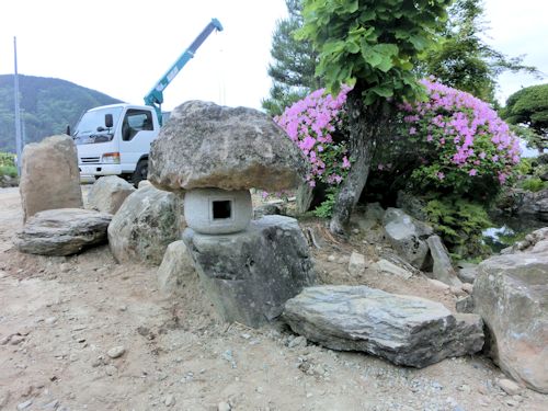 さて庭づくりはというと、まずは大きな石や灯篭の移動からです。