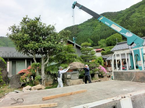 ユニック車を用意して、石を吊り上げてバランスをとりながら・・・
