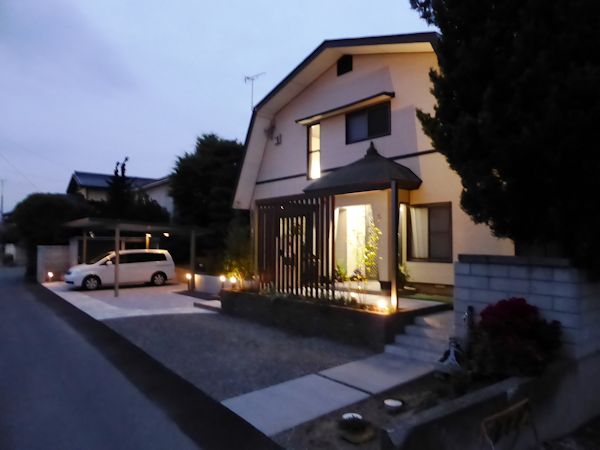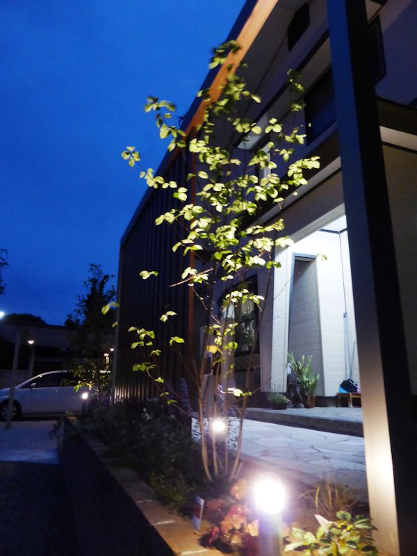 ライトアップするとその樹形がより強調され、素敵な門まわりになりました。